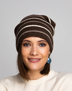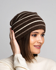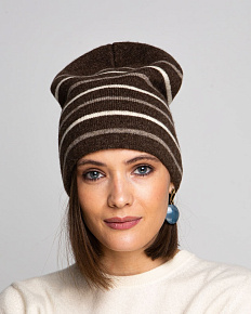 Красивая темно-коричневая шапка с полосками. которые ее очень украшают. |