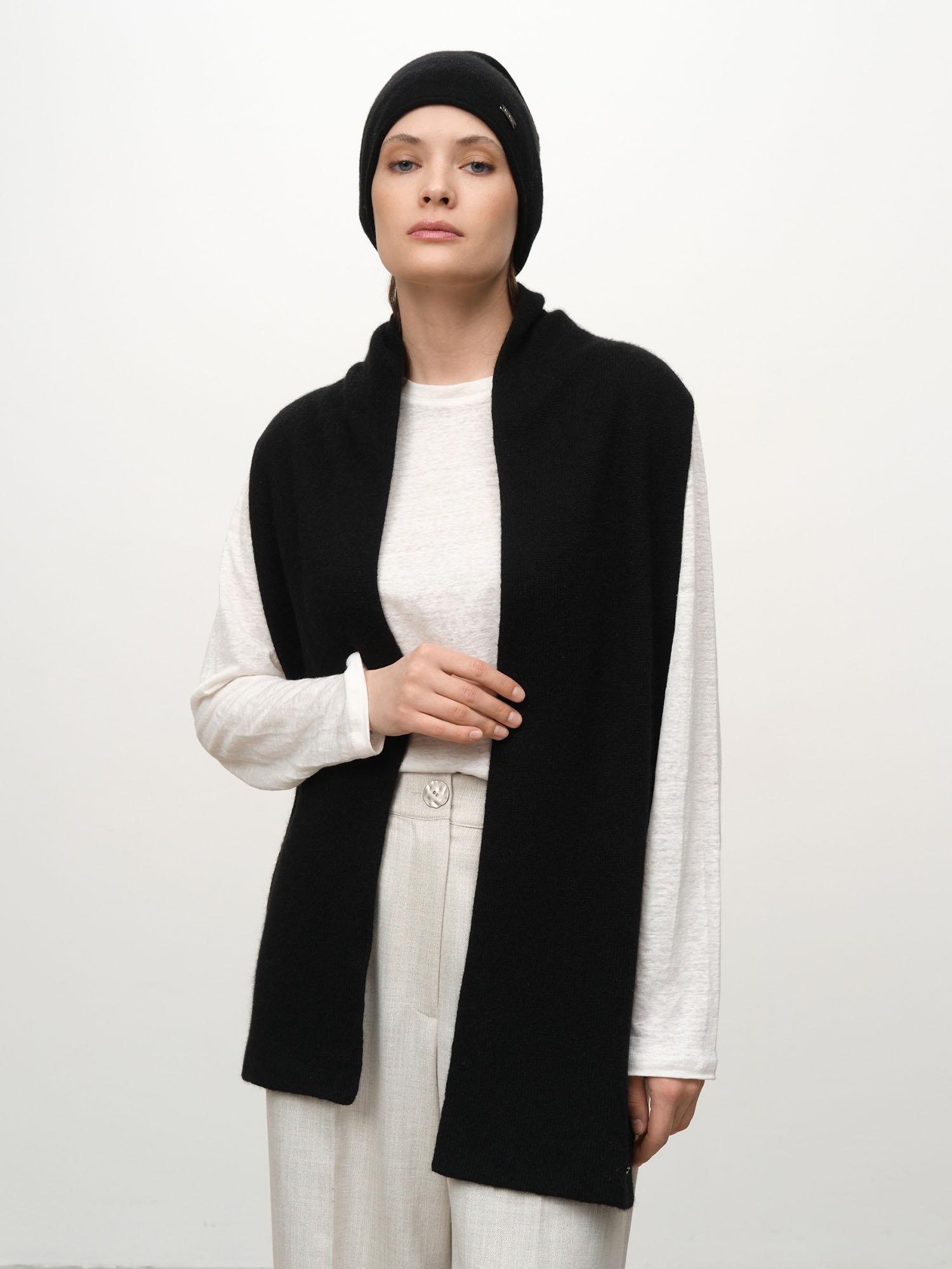 Абсолютная классика в каждом сантиметре. Глубокий насыщенный черный цвет, благородная матовая фактура и невесомая мягкость – этот шарф станет вашим верным спутником на долгие годы. Это не просто аксессуар – это вечная классика вашего гардероба.