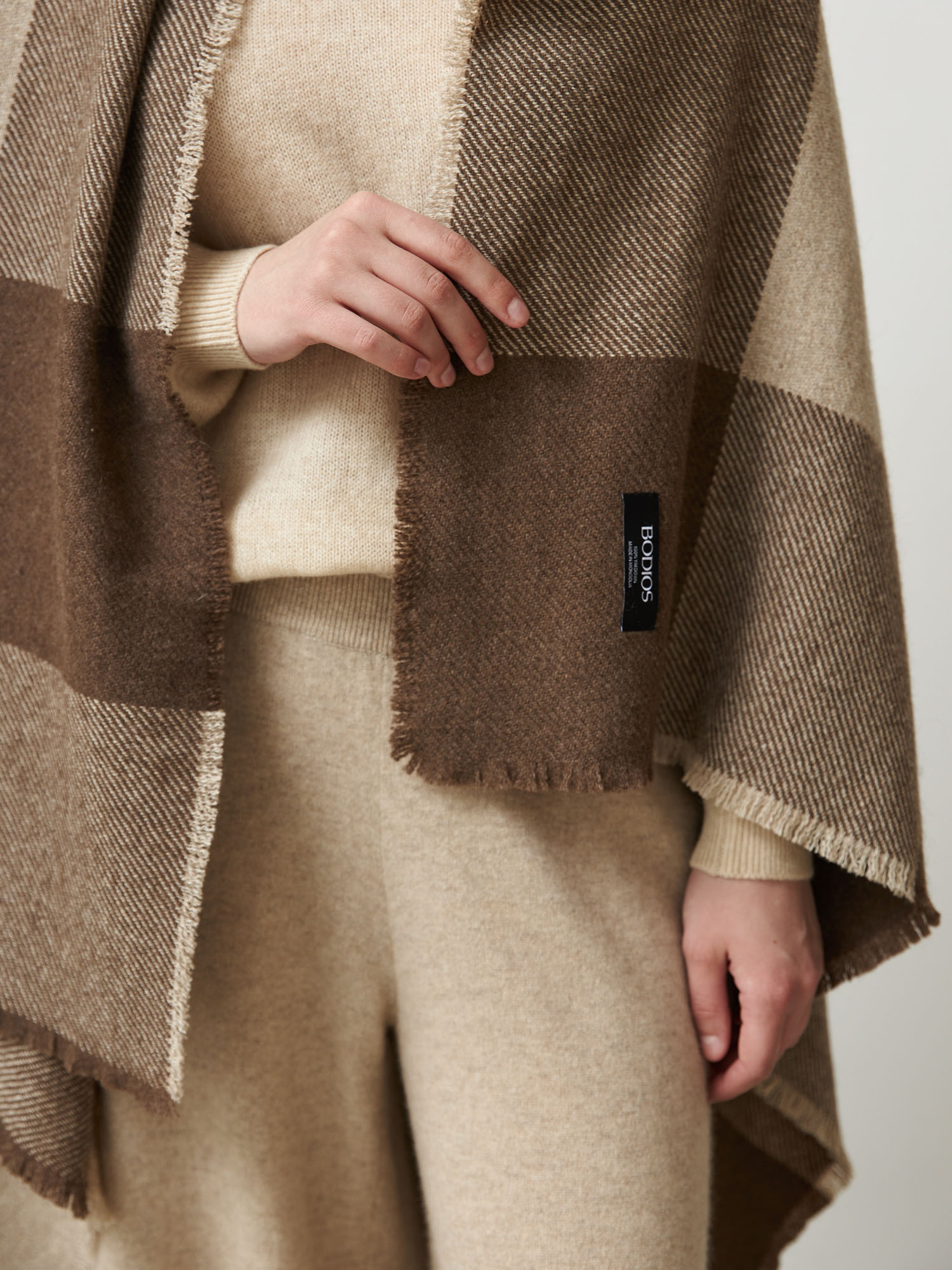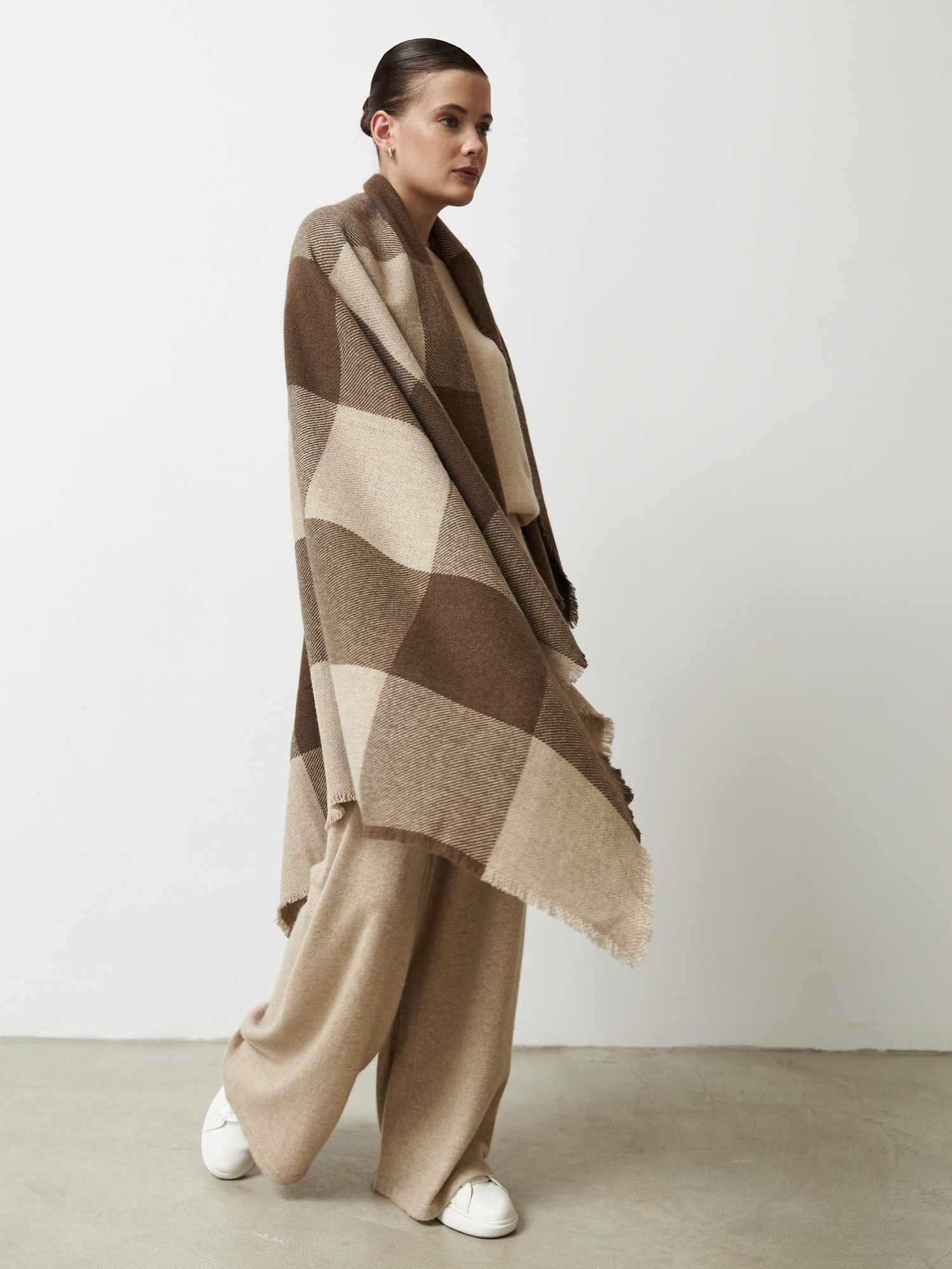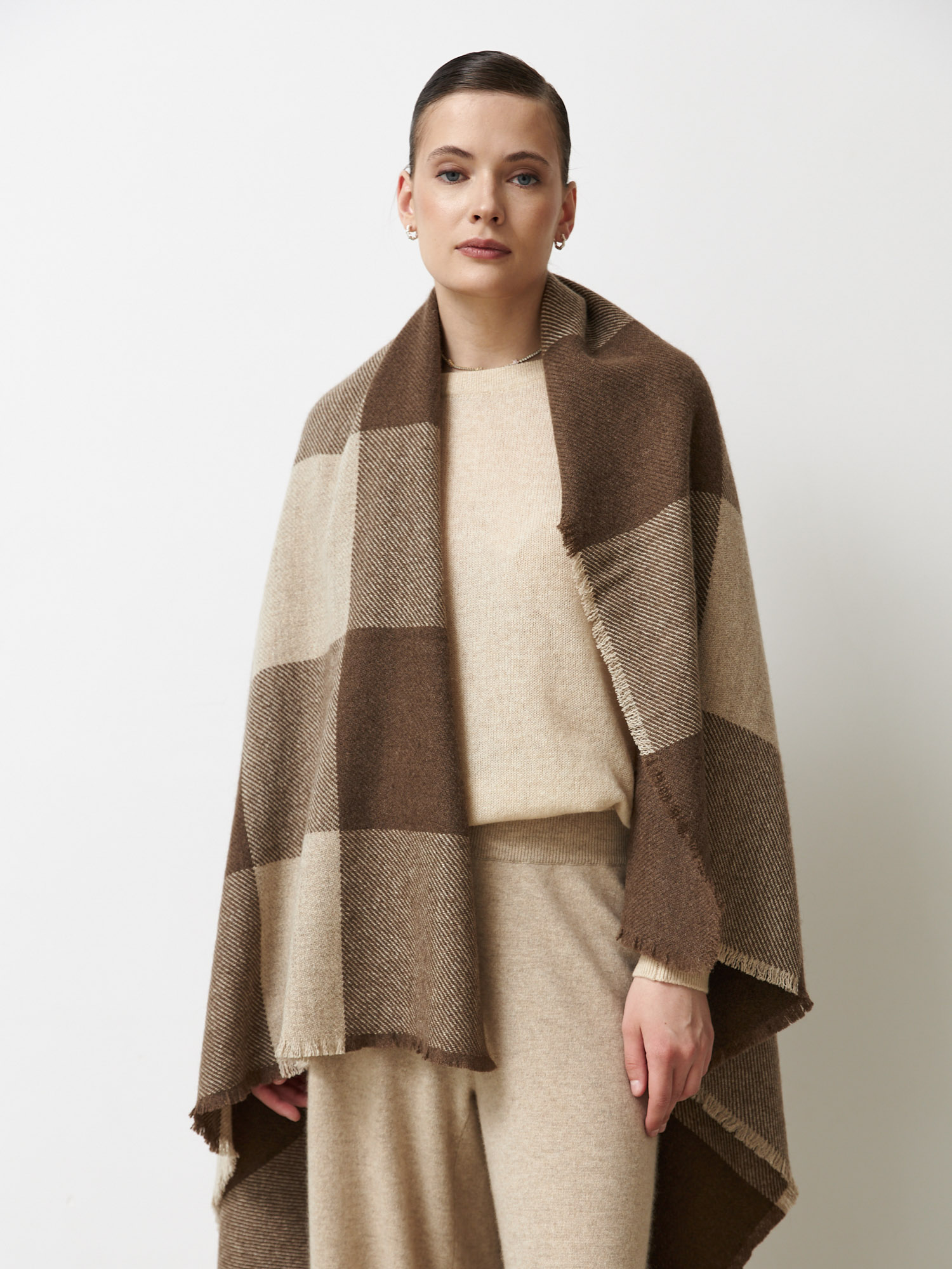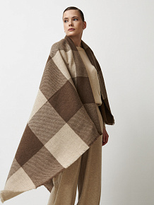 Клетчатый дизайн в классических бежево-коричневых оттенках придаёт изделию элегантный и универсальный вид, который будет гармонично сочетаться с любыми предметами вашего гардероба. Большой размер платка позволяет носить его как накидку, шарф или даже использовать в качестве уютного пледа.