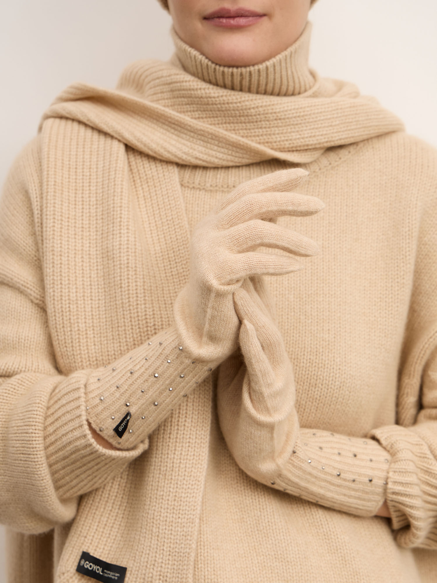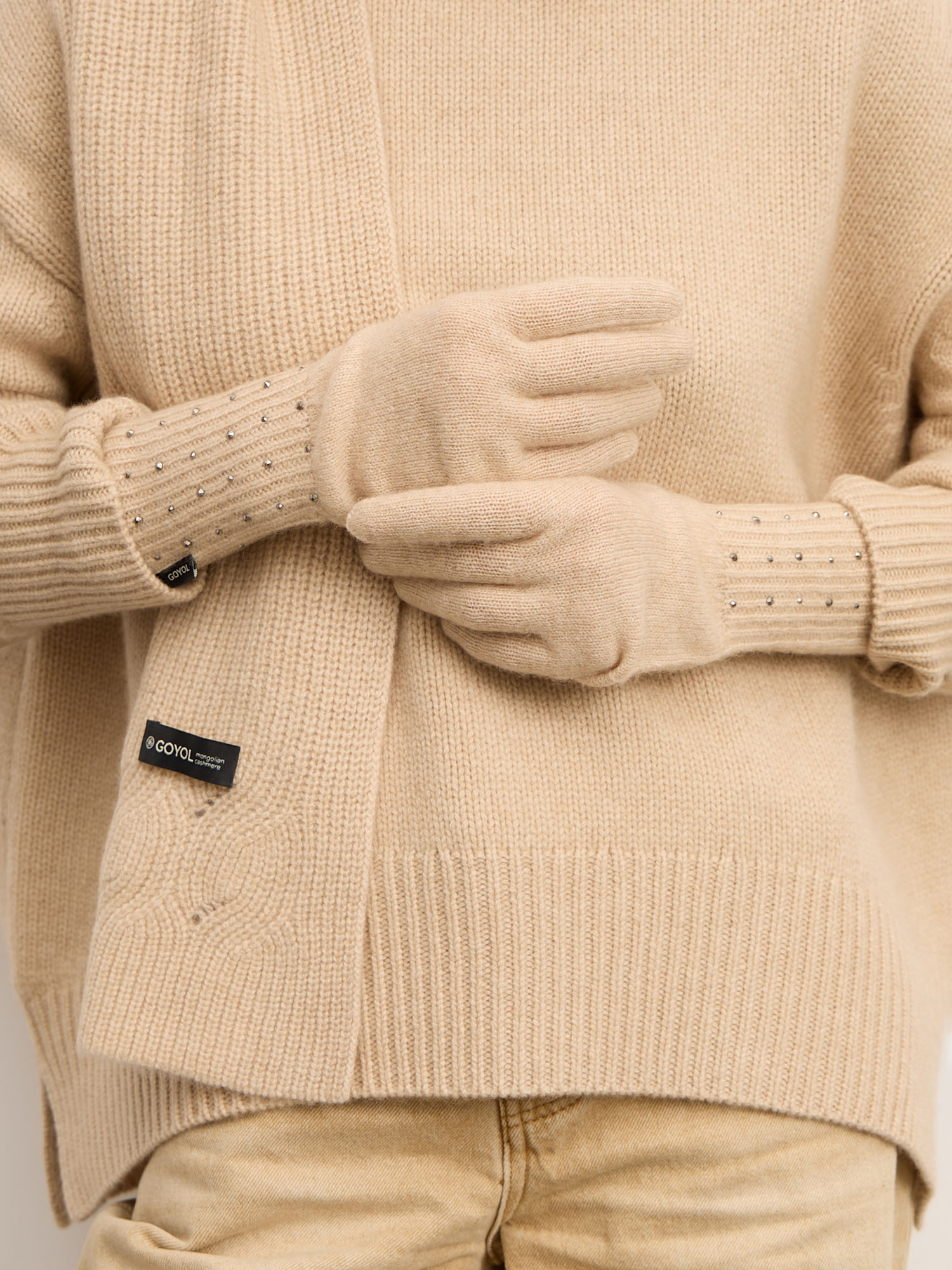 Изысканные перчатки из 100% монгольского кашемира в мягком бежевом оттенке — это сочетание утончённого стиля, тепла и комфорта. Декор из мелких страз придаёт аксессуару лёгкое сияние и делает его акцентом любого зимнего образа.