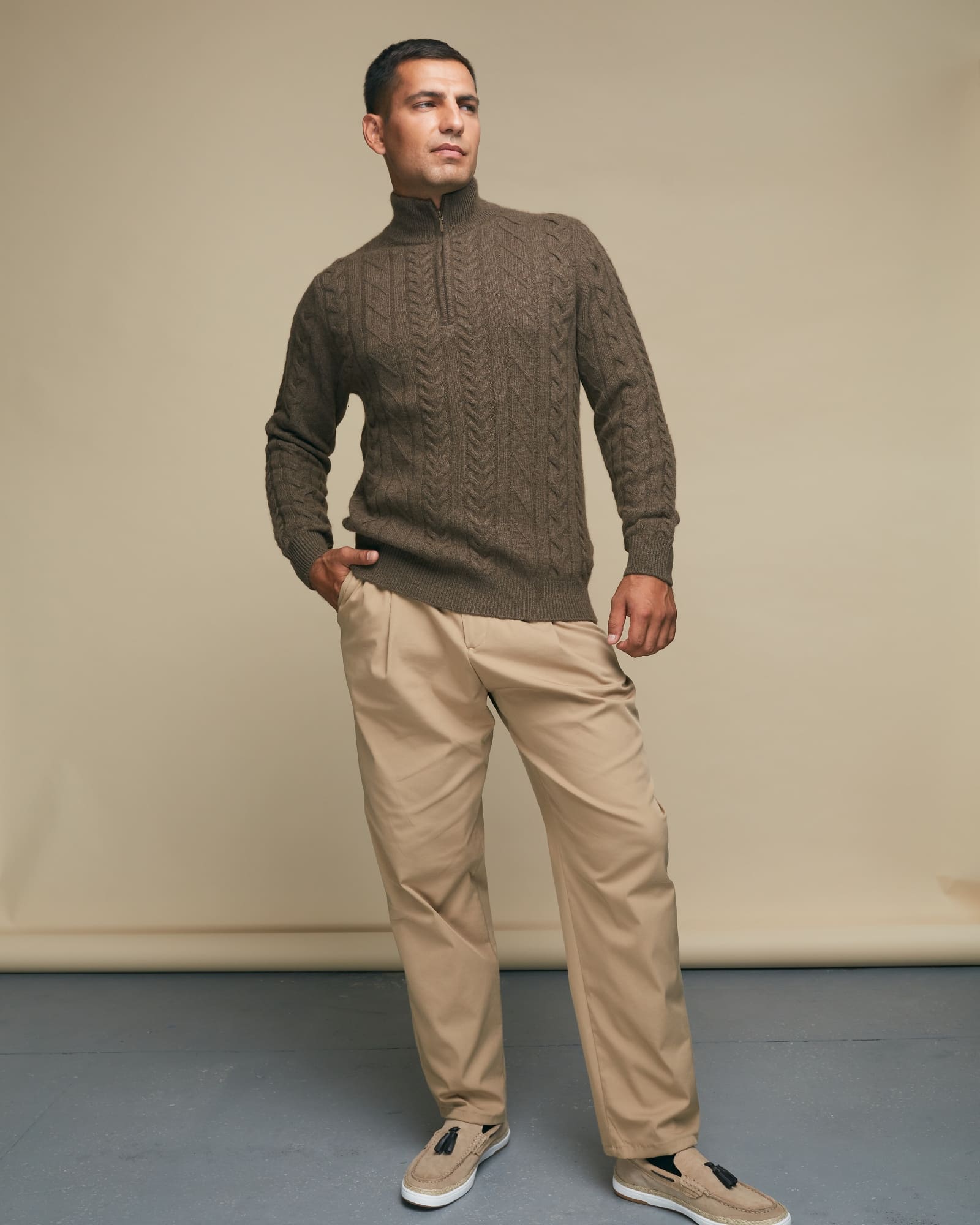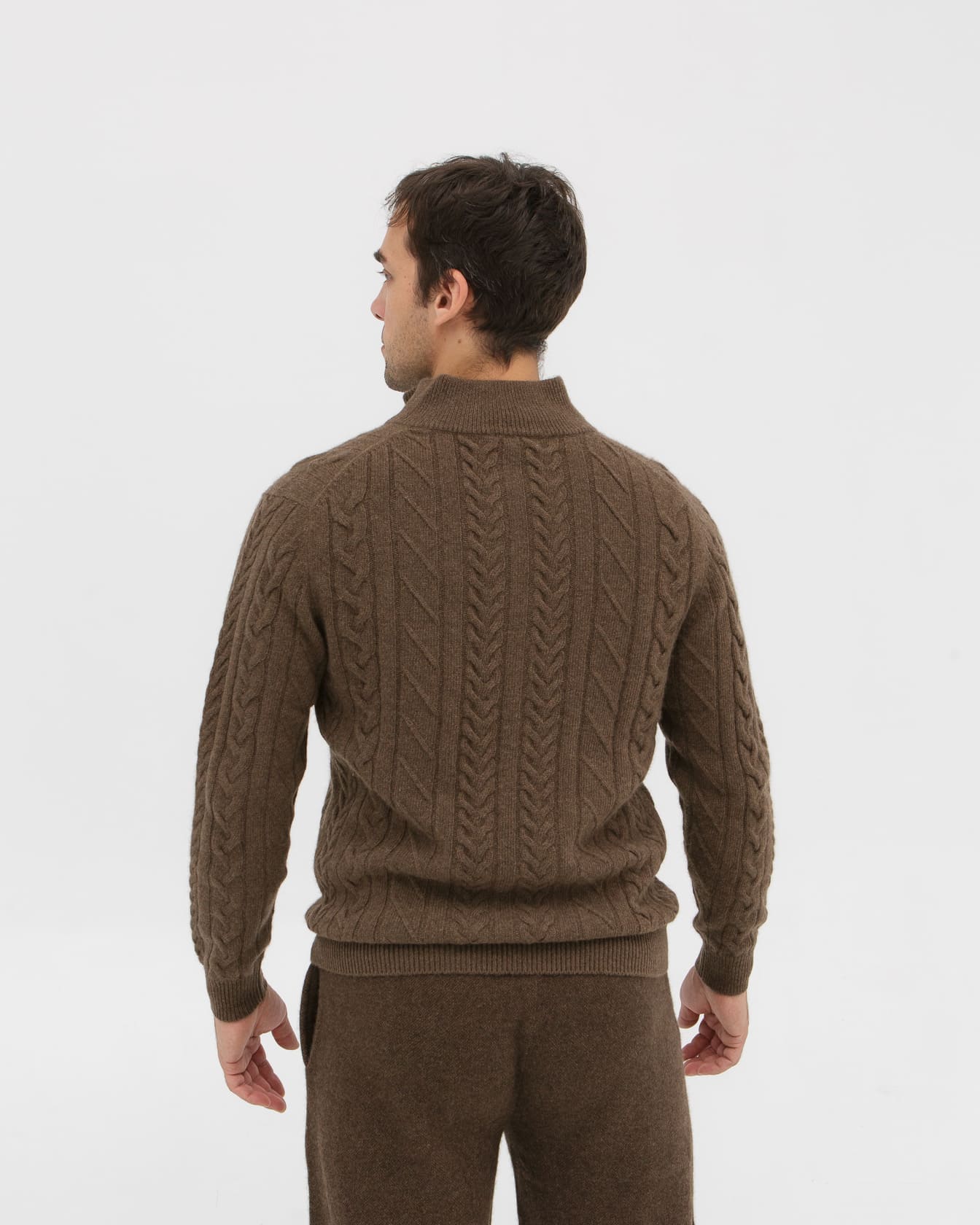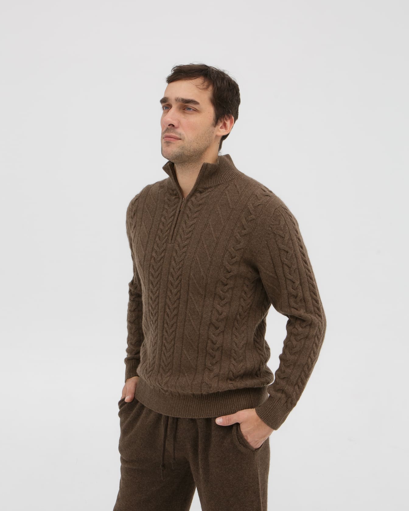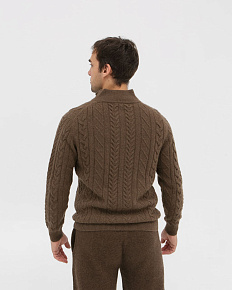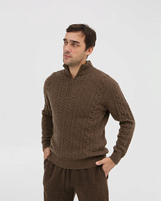 Элегантный дизайн с воротником на молнии и классическим узором "косы" придает джемперу стильный и современный вид. Коричневый цвет универсален – он легко сочетается с различными оттенками и стилями одежды, от деловых брюк до повседневных джинсов.