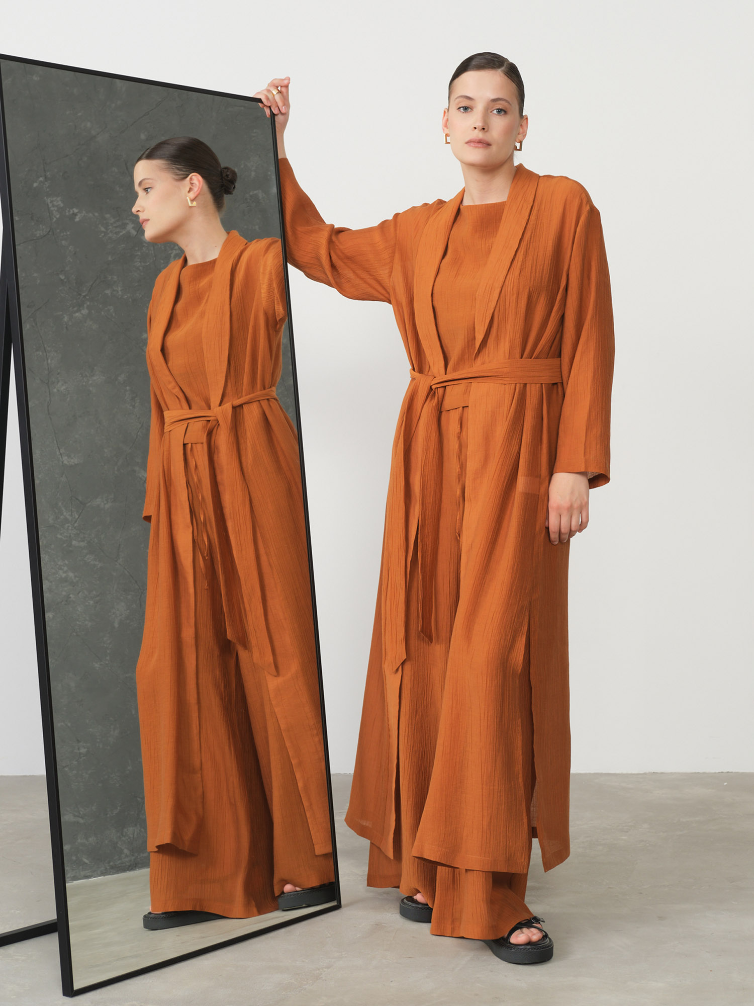 Свободный крой в стиле кимоно придает образу легкость и изысканность, а длинный фасон визуально вытягивает силуэт, добавляя элегантности любому комплекту. Глубокий терракотовый оттенок привносит в образ теплоту и благородство, великолепно сочетаясь как с нейтральными, так и с контрастными цветами. Широкий пояс подчеркивает талию, создавая женственный силуэт и позволяя варьировать посадку изделия.