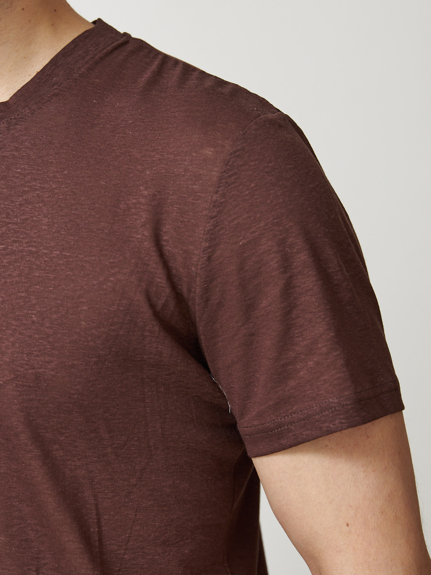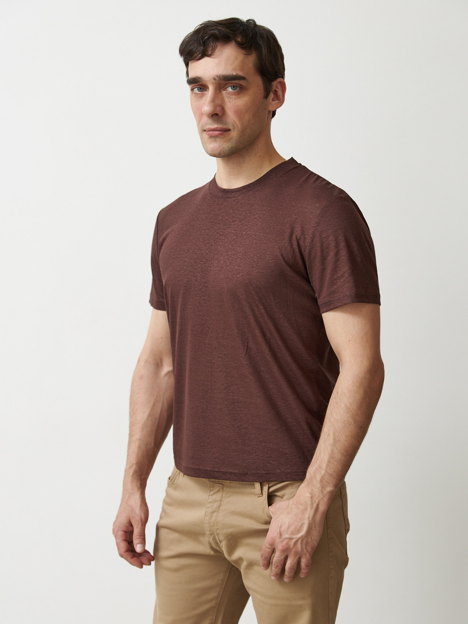 Классический крой с аккуратными швами и свободным силуэтом гарантирует свободу движений. Короткий рукав и круглый вырез создают универсальную базу для повседневных образов — сочетайте футболку с льняными брюками, джинсами или шортами. Насыщенный шоколадный оттенок добавляет образу сдержанную элегантность, легко комбинируясь как с нейтральными, так и с яркими цветами.