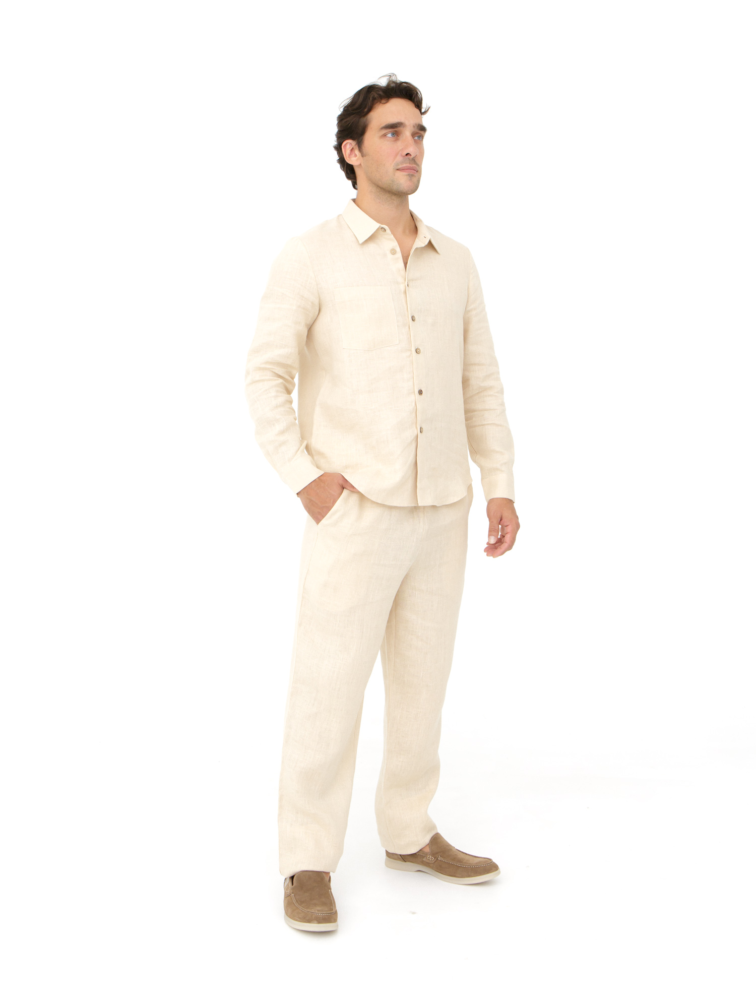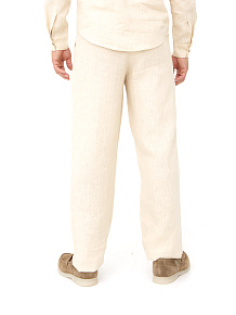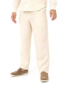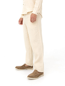 Классический прямой крой с оптимальной посадкой подчеркивает мужественный силуэт, сохраняя полную свободу движений. Нежный молочный оттенок с мягким матовым отливом делает эти брюки универсальной основой летнего гардероба — они одинаково хорошо сочетаются с рубашками, футболками и поло, позволяя создавать как повседневные, так и более формальные образы.