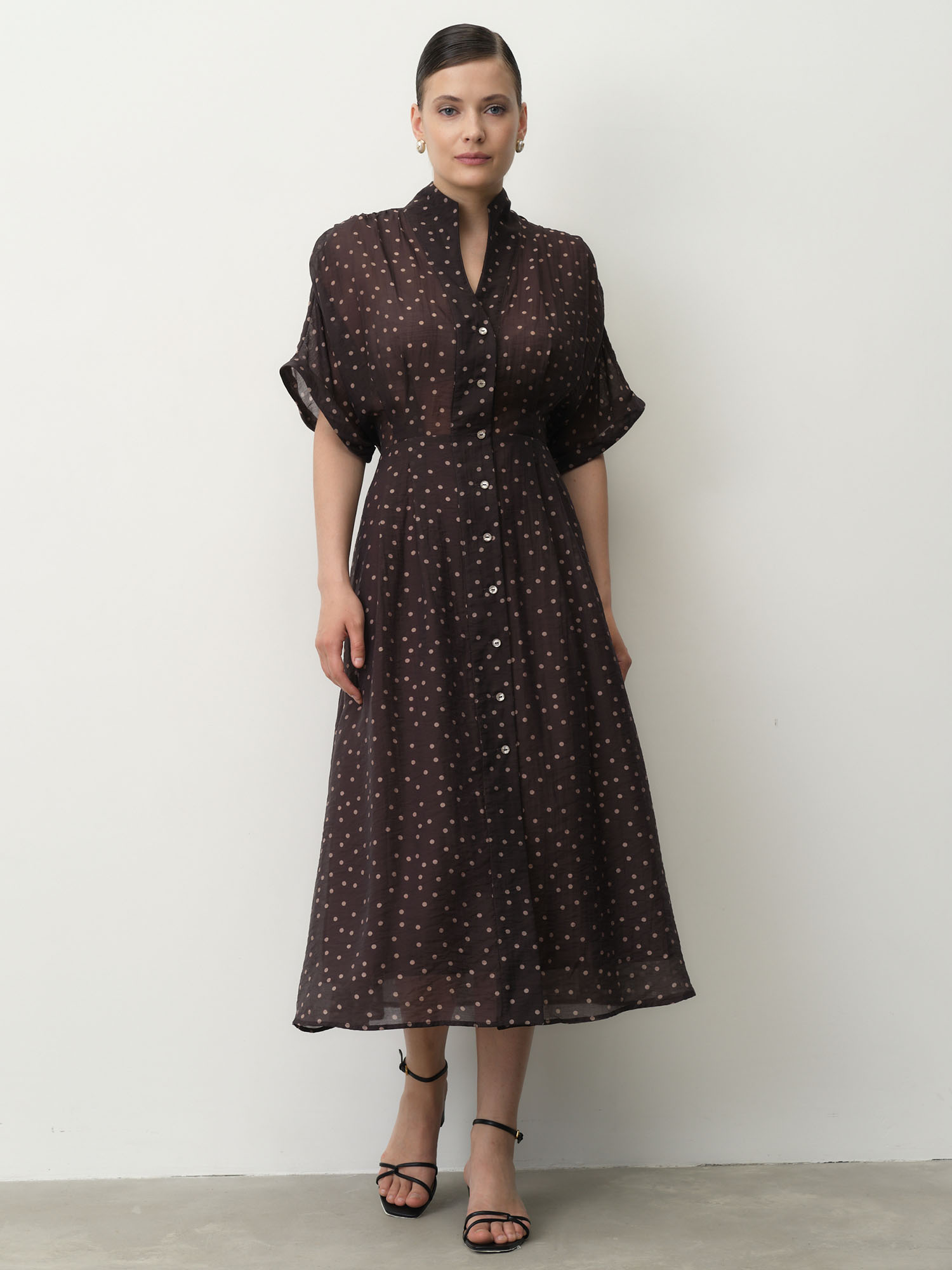 Платье из тенселя чёрного цвета в горошек — это идеальный баланс между классикой и современностью. Оно подчёркивает фигуру, не перегружает образ, дышит и мягко струится при движении. Безупречный выбор на каждый день и на особый случай.