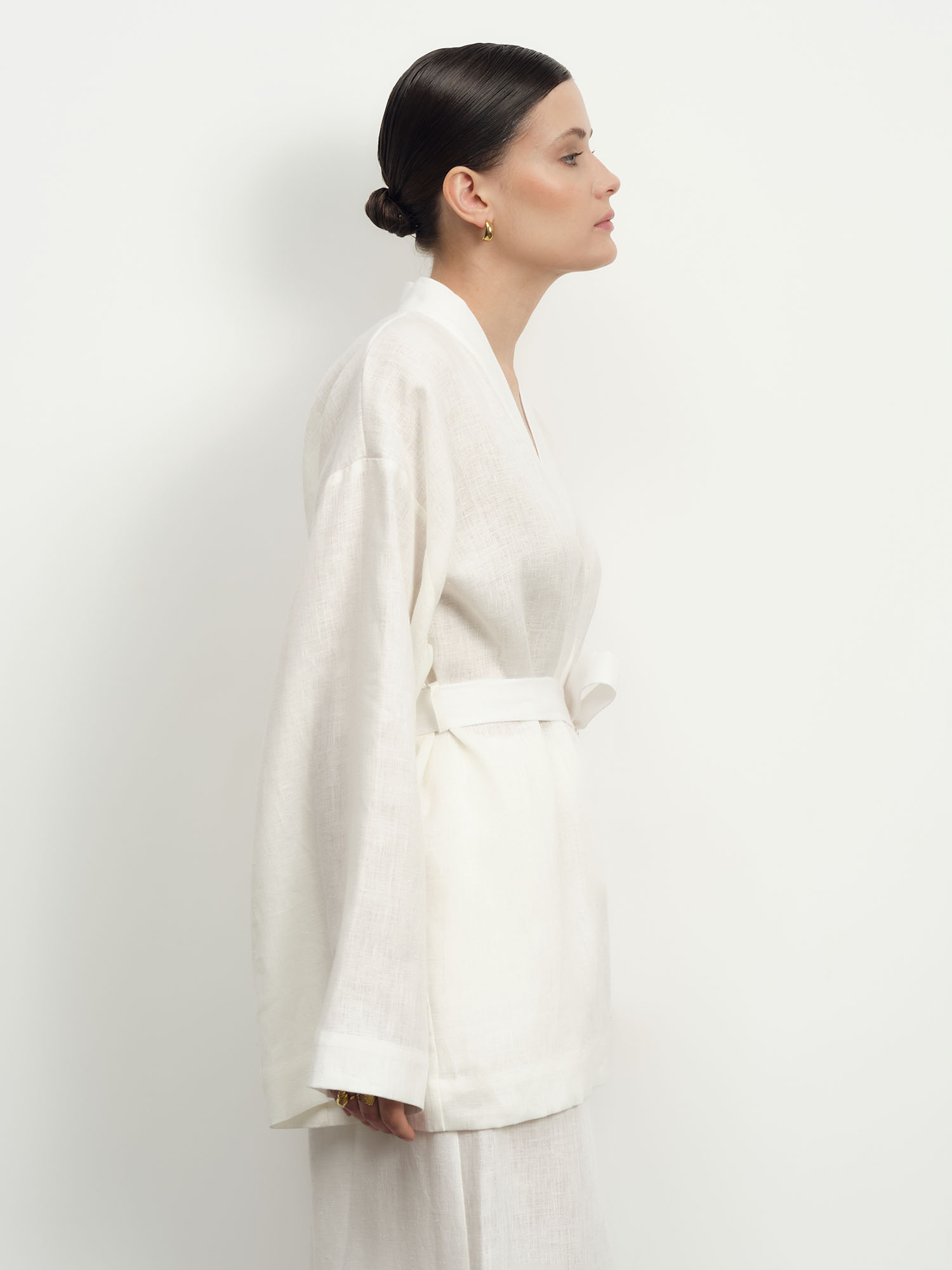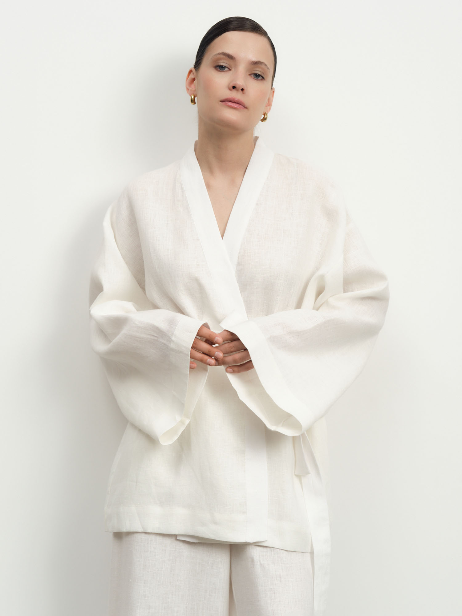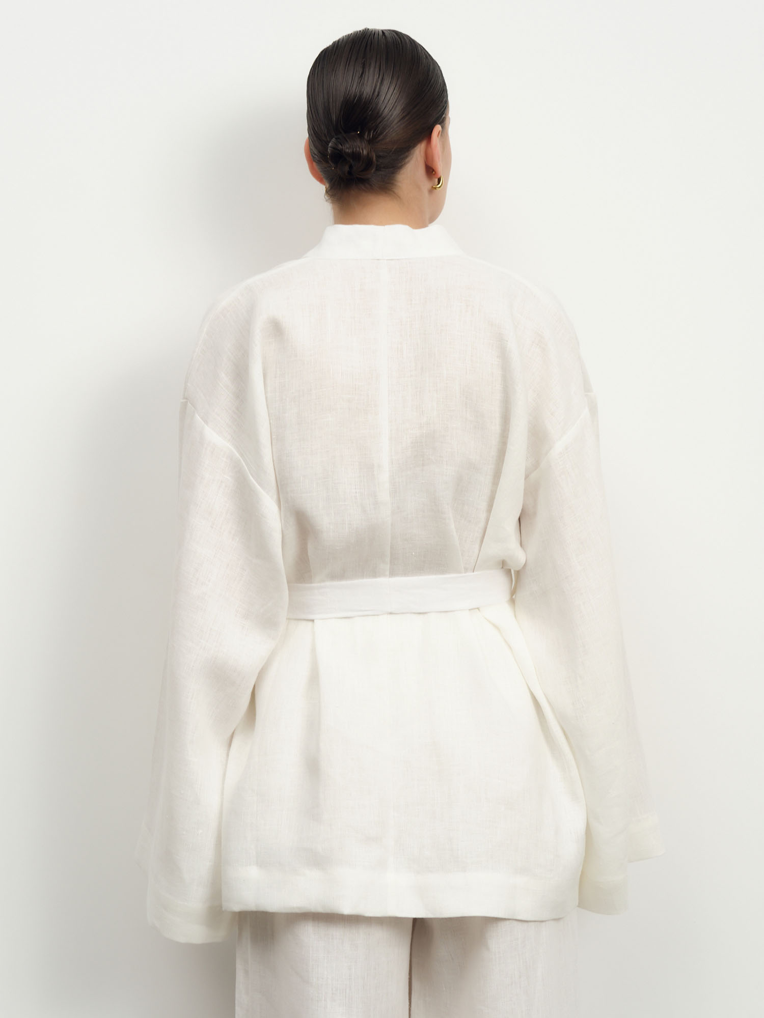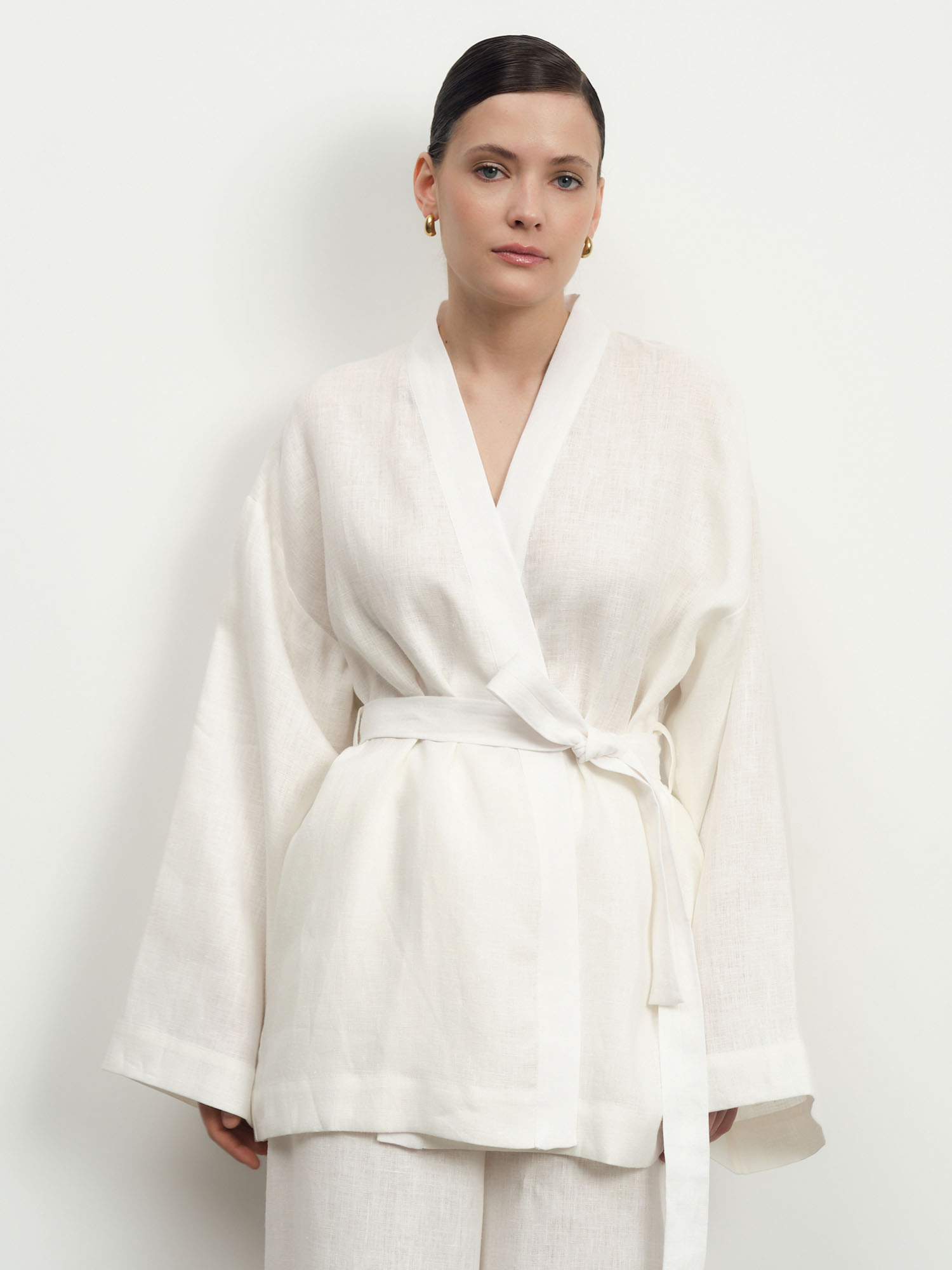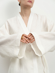 Белоснежный жакет в стиле кимоно из натурального льна – воплощение свежести и стиля. Идеальный летний аксессуар, который добавит образу воздушности и элегантной небрежности.