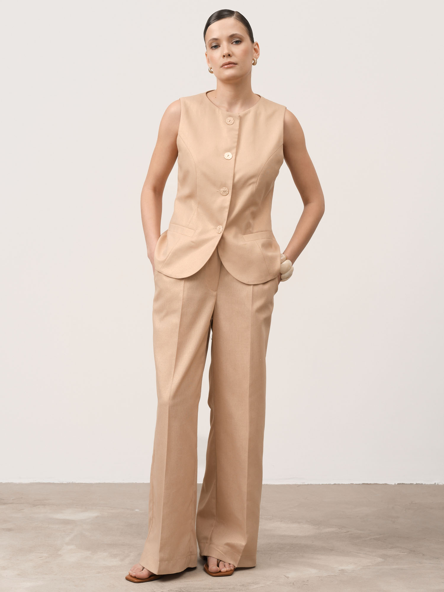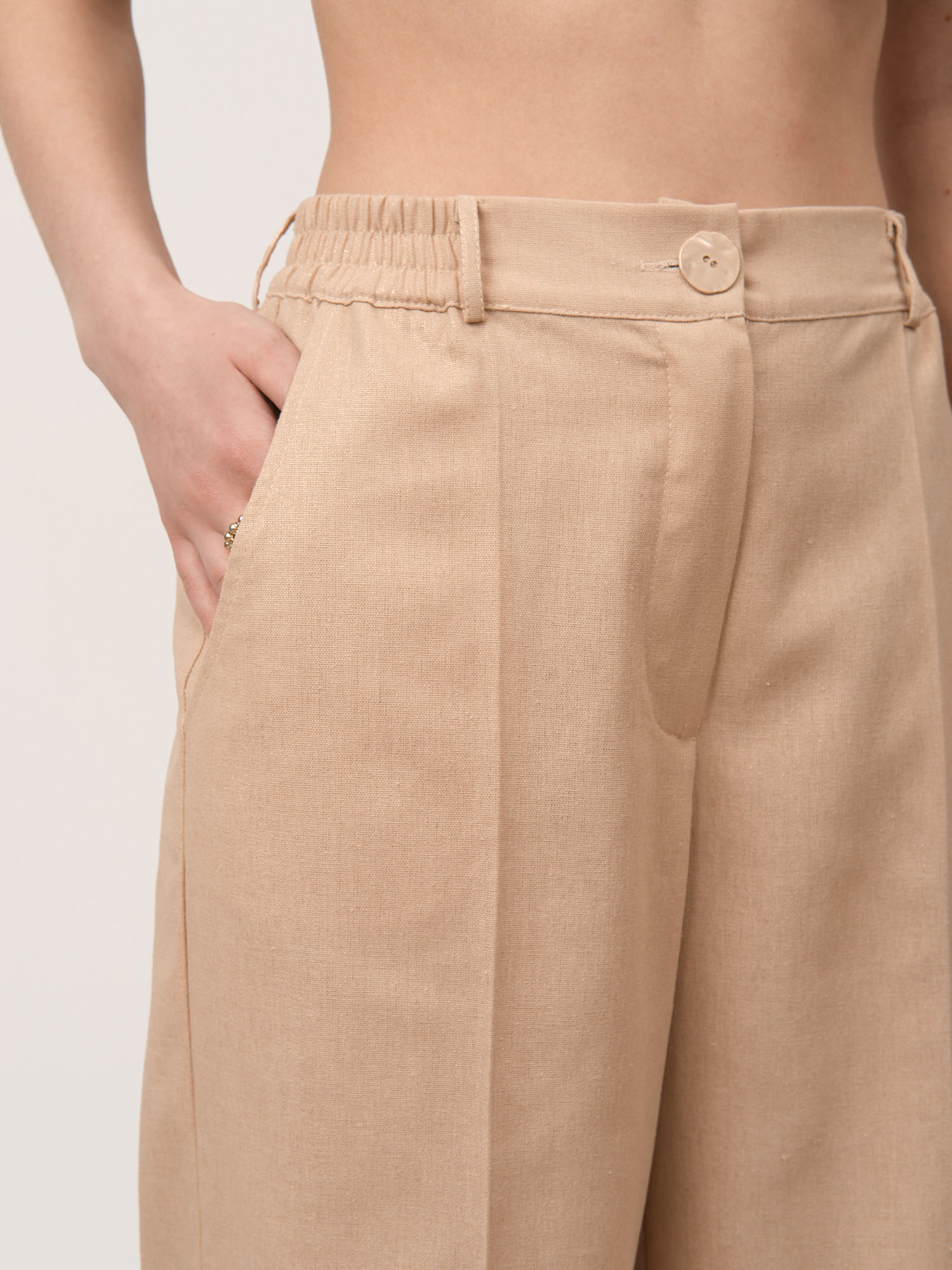 Роскошная натуральность и благородный блеск — женские брюки из льна с вискозой в золотистом оттенке воплощают собой идеальный баланс комфорта и изысканности. Это изделие для тех, кто выбирает премиальные натуральные материалы и утонченный стиль.