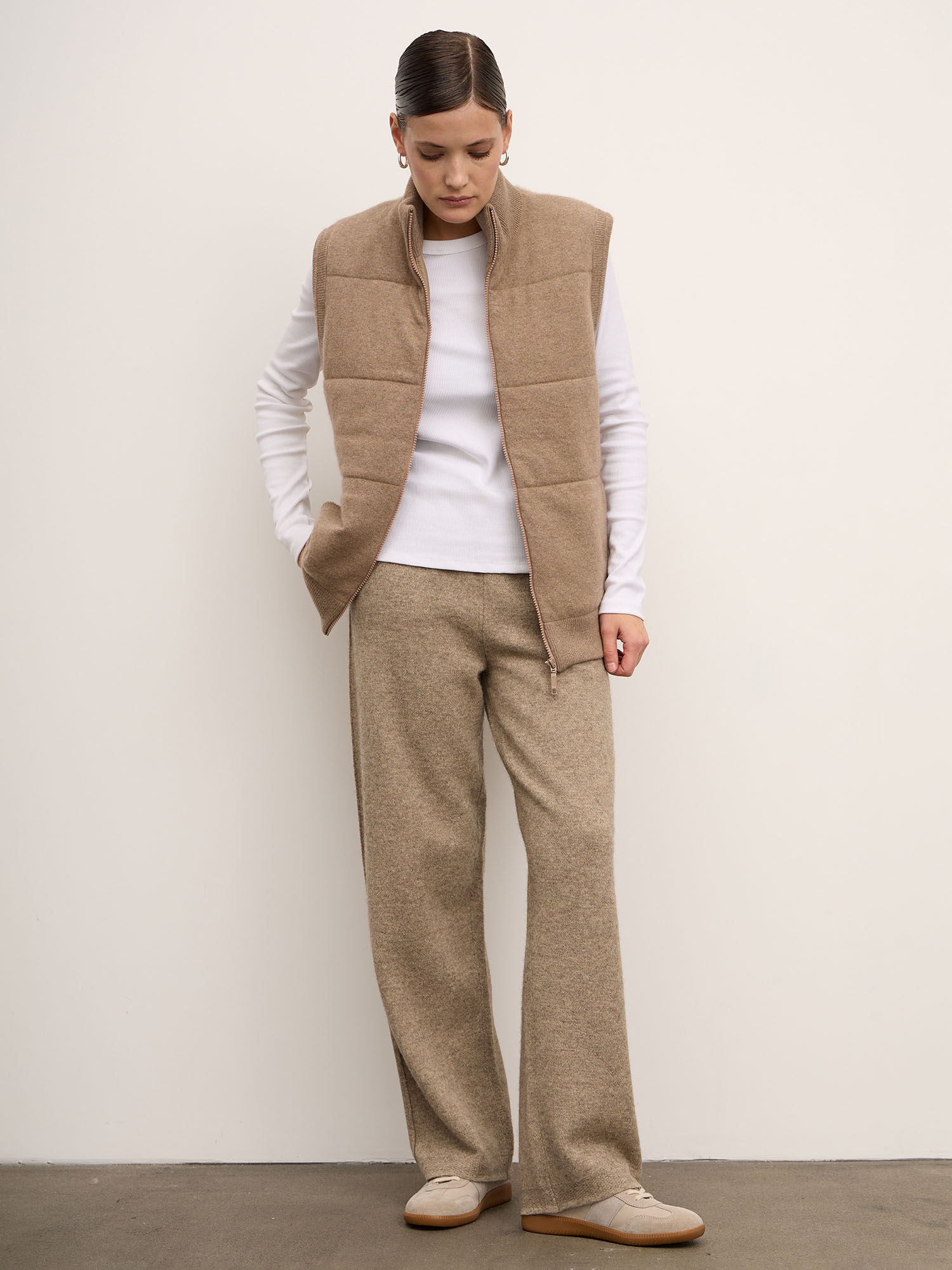 - Идеально смотрятся с кашемировыми джемперами, кардиганами и кроссовками/лоферами в нейтральных тонах