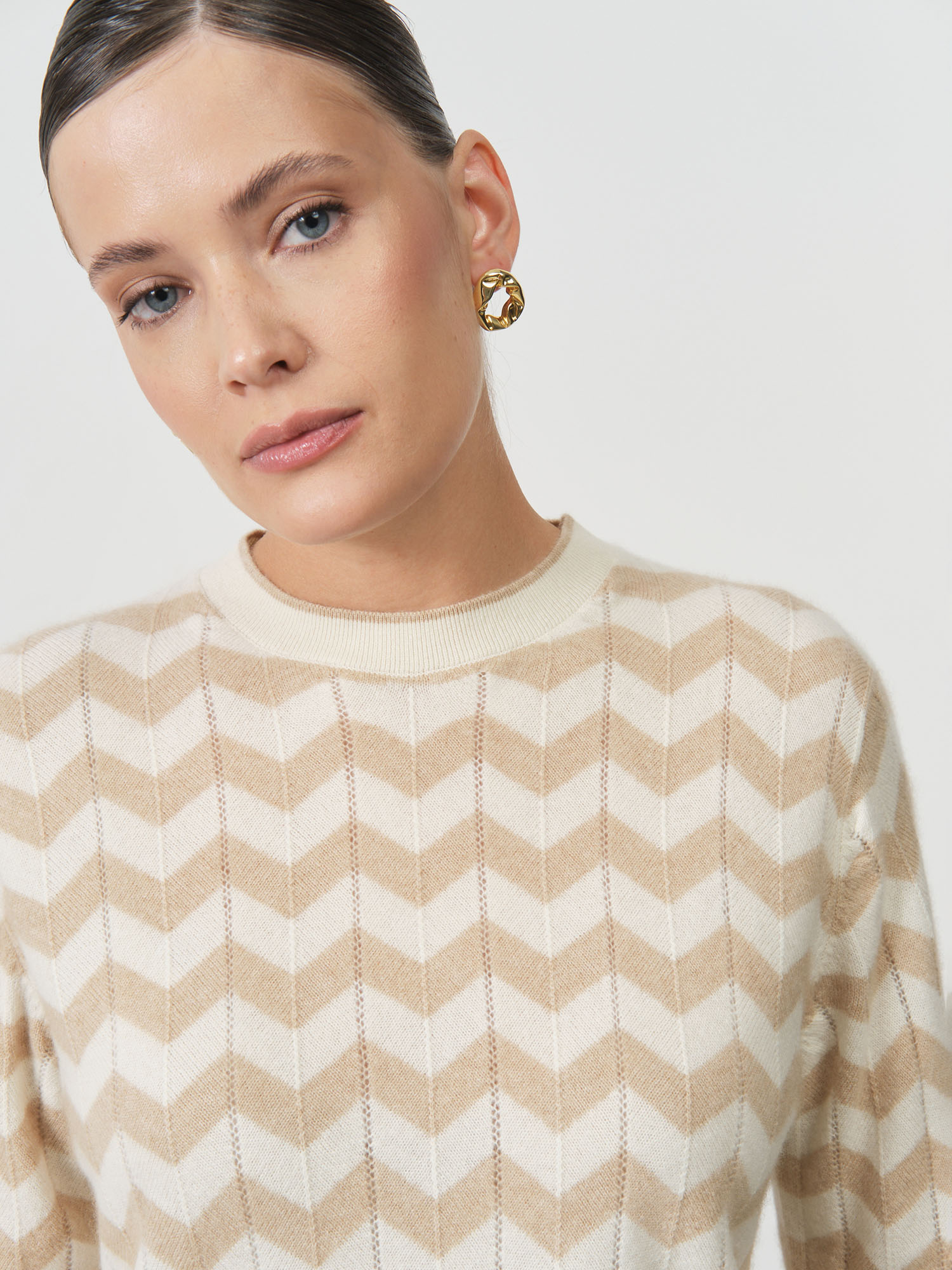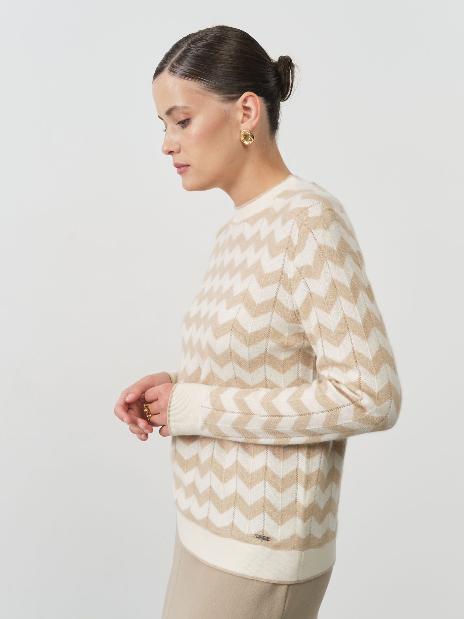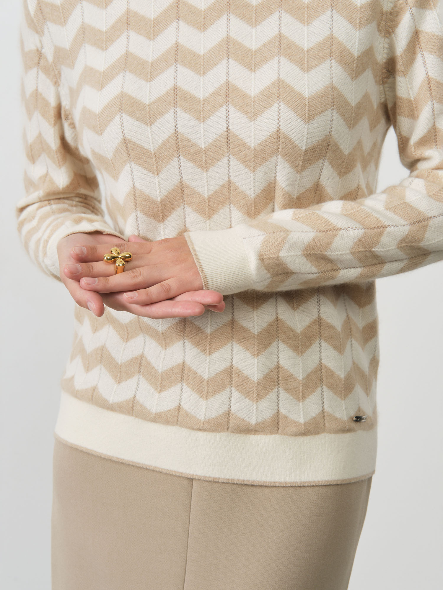 Благородный нейтральный оттенок делает эту модель универсальной основой гардероба. Джемпер одинаково органично смотрится с деловыми костюмами, создавая элегантный офисный образ, и с джинсами для повседневных прогулок. Полуприлегающий крой мягко обрисовывает силуэт, сохраняя при этом комфортную свободу движений, а классический вырез горловины добавляет образу завершенность.