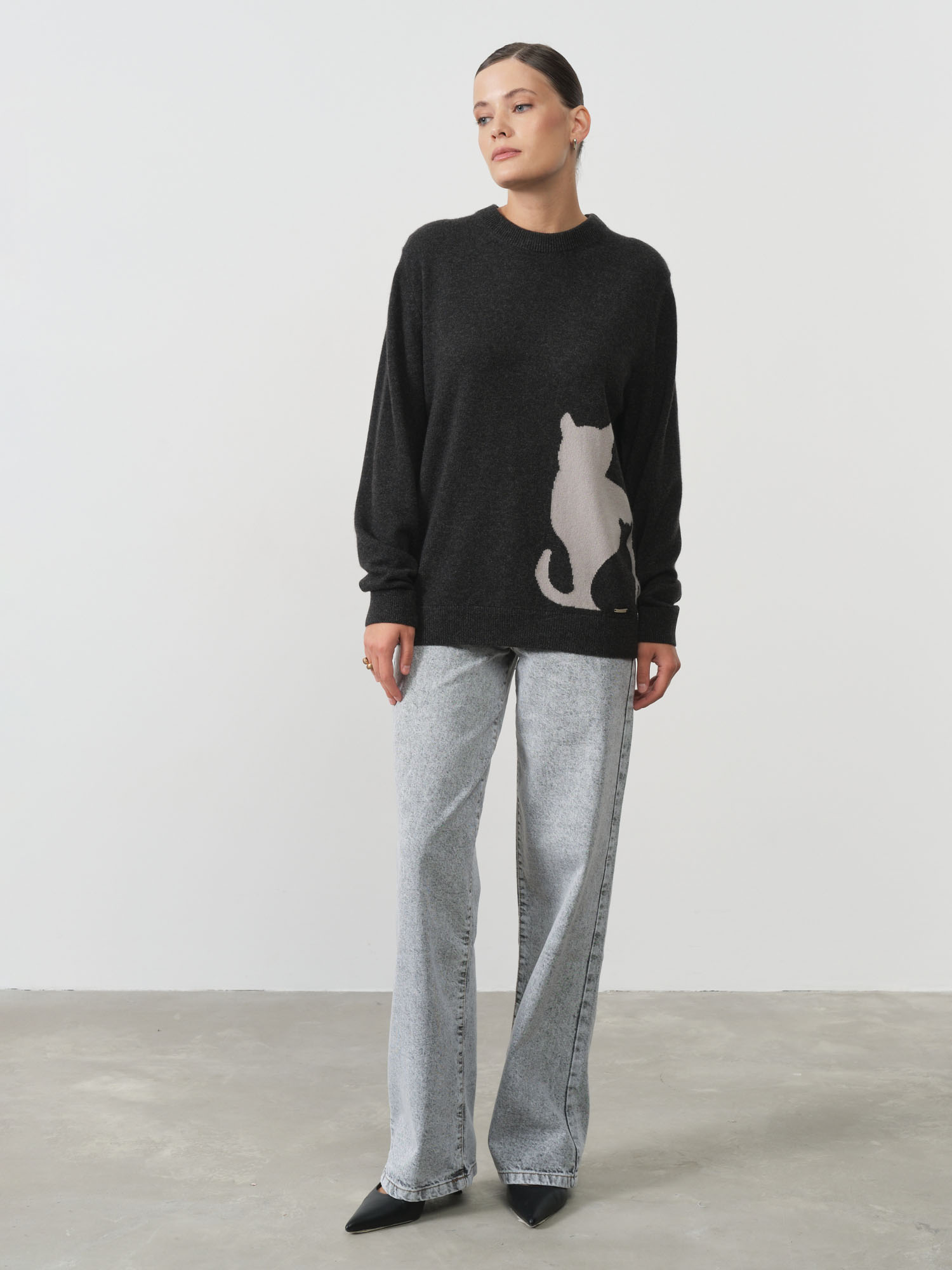 Свободный силуэт с классическим круглым вырезом. Контрастный жаккардовый рисунок добавляет индивидуальности и делает модель акцентной.