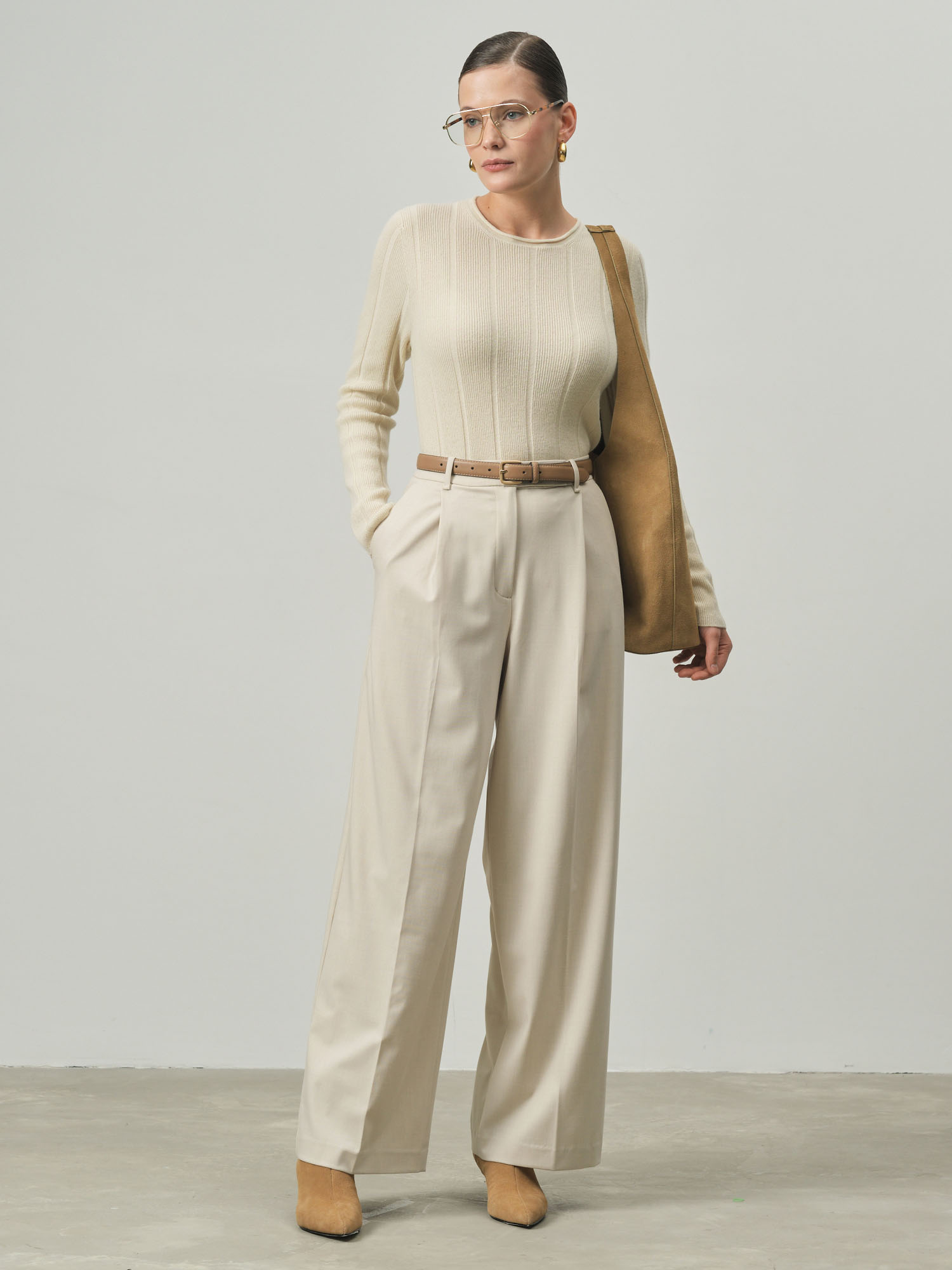 Теплый молочно-белый оттенок, напоминающий первые лучи утреннего солнца, делает этот джемпер универсальной палитрой для любых образов. Он одинаково прекрасно смотрится с деловыми брюками и юбками, создавая элегантный офисный look, и с джинсами для непринужденных городских прогулок. Полуприлегающий крой мягко обрисовывает силуэт, сохраняя при этом свободу движений.