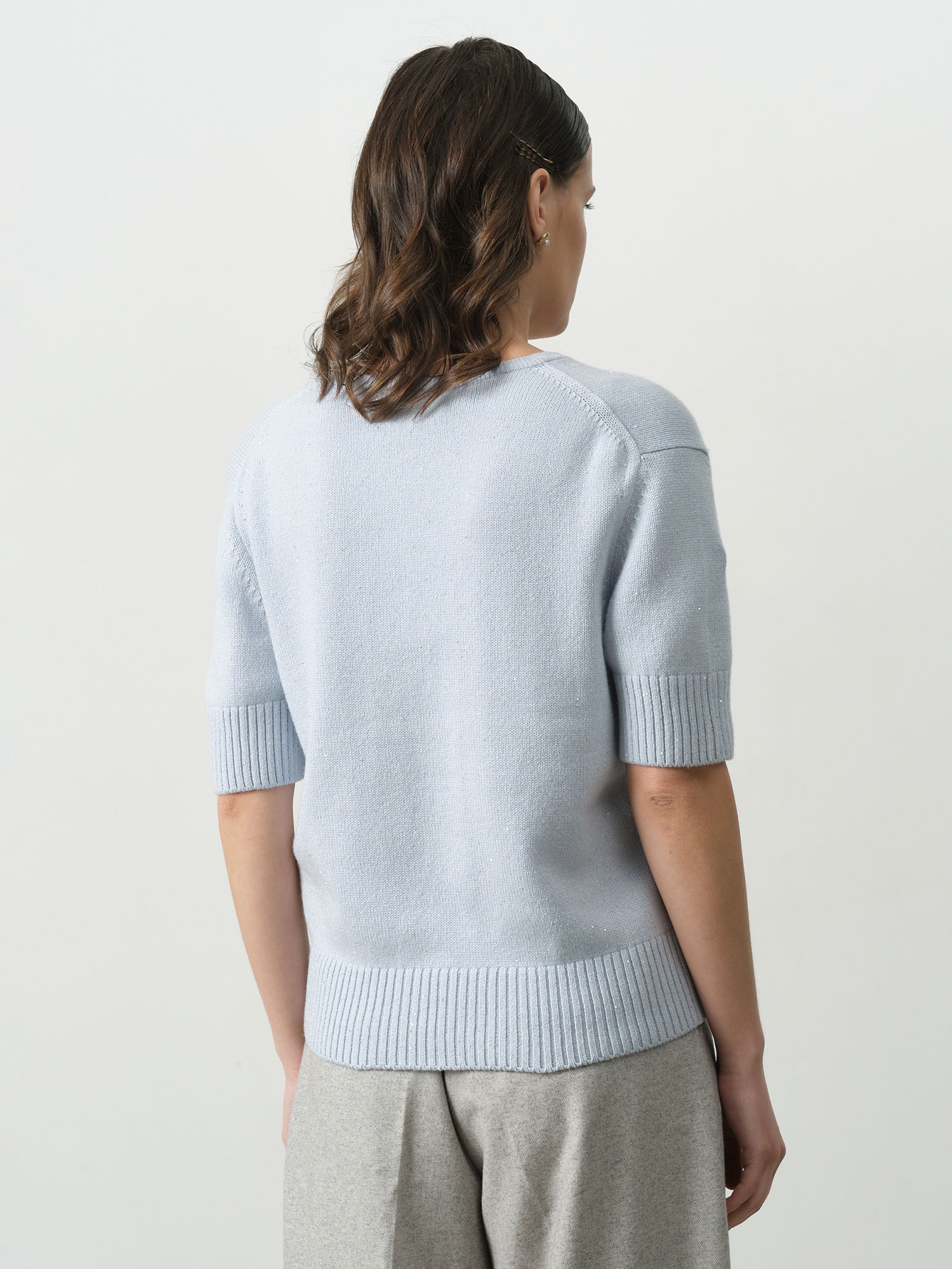 Джемпер из кашемира с люрексом в аквамариновом оттенке — это сочетание нежности, природного блеска и безупречного комфорта.