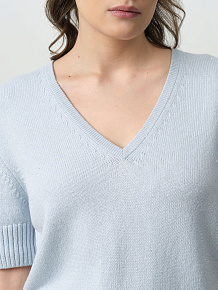 Модель выполнена в расслабленном крое с короткими рукавами и V-образным вырезом. Нити люрекса придают поверхности лёгкое мерцание, которое особенно красиво проявляется при естественном или вечернем освещении. Джемпер мягкий, приятный к телу, не колется и отлично держит форму.
