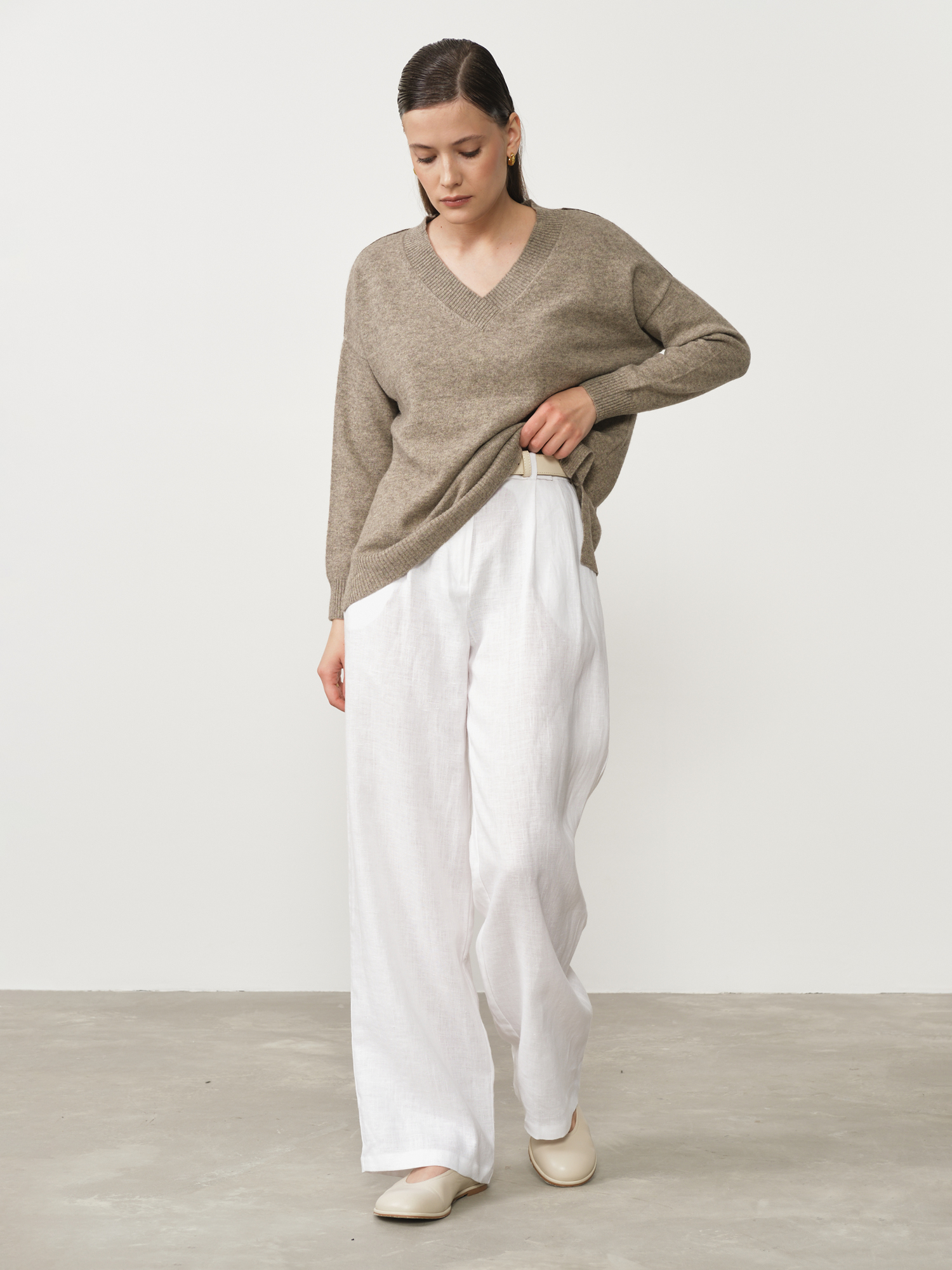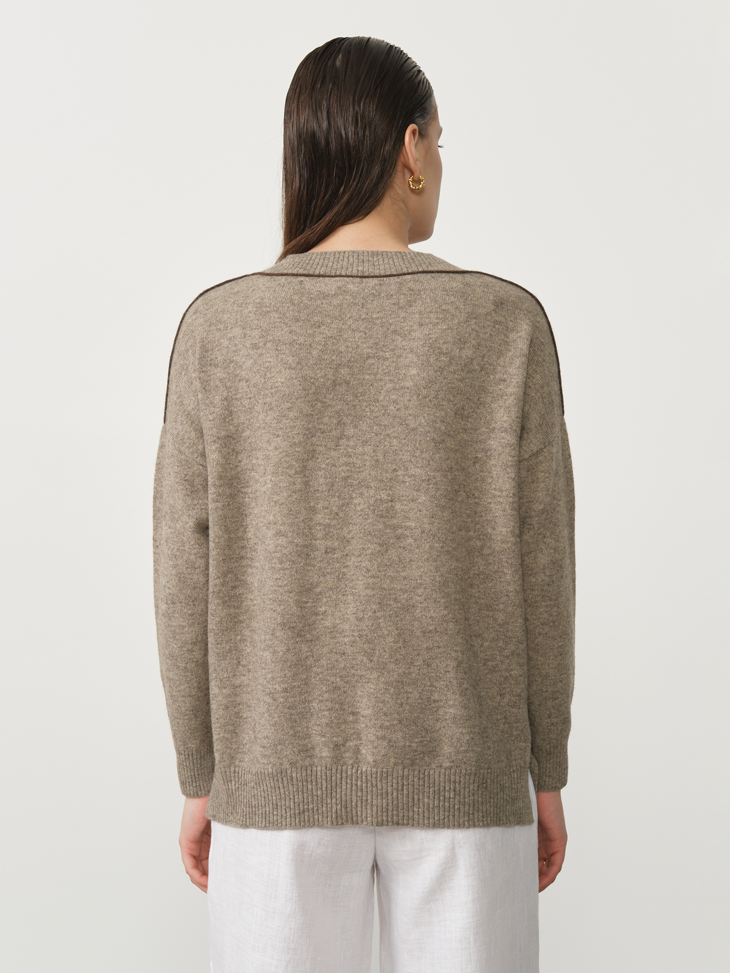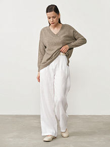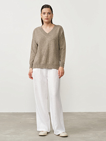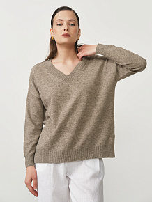 V-образный вырез придает модели женственность и делает её универсальной для сочетания c различными стилями одежды. Свободный крой обеспечивает максимальный комфорт в носке и позволяет легко создавать стильные образы. Джемпер отлично комбинируется с классическими брюками, юбками, джинсами и платьями, подходя для офисных, повседневных и более изысканных образов.