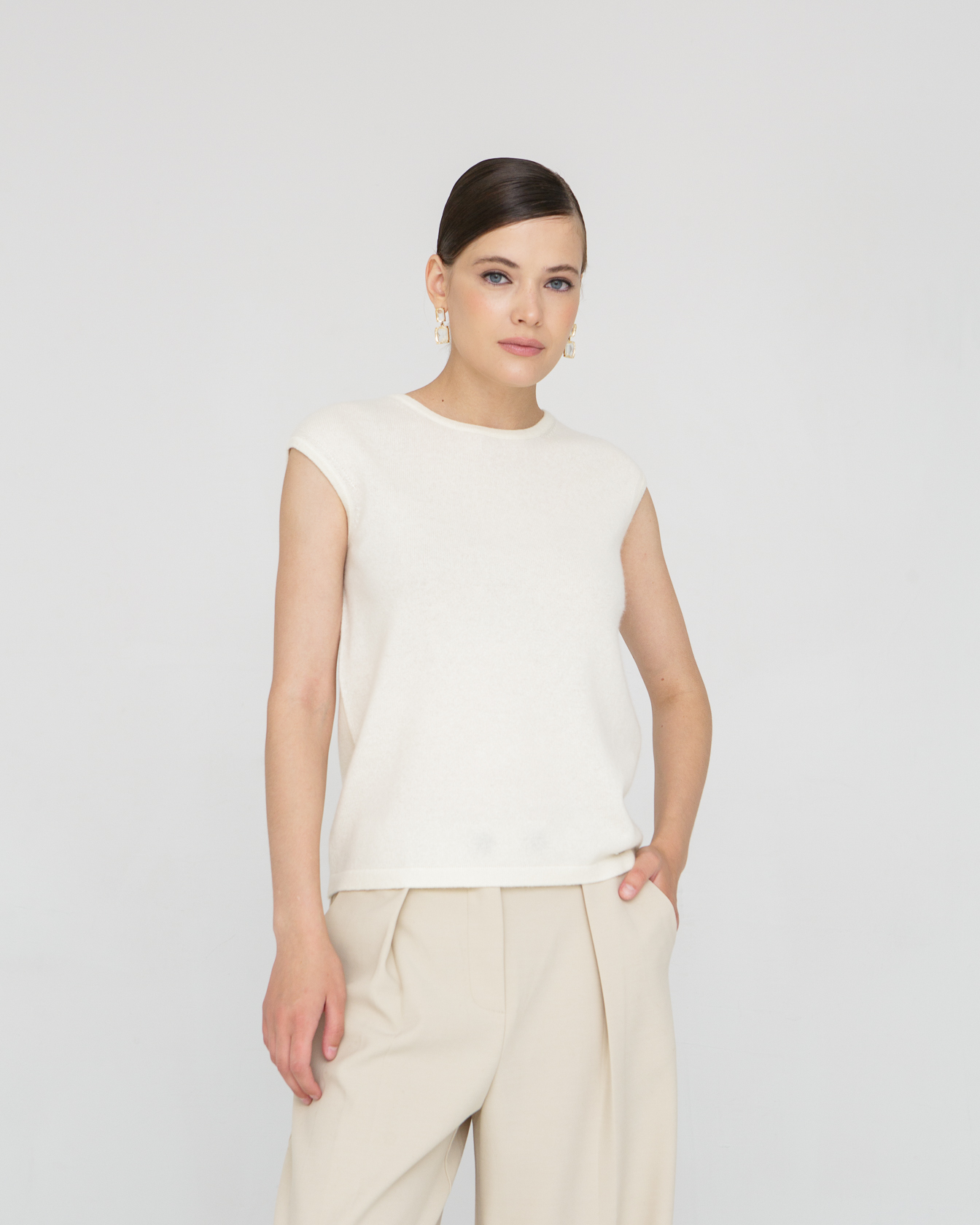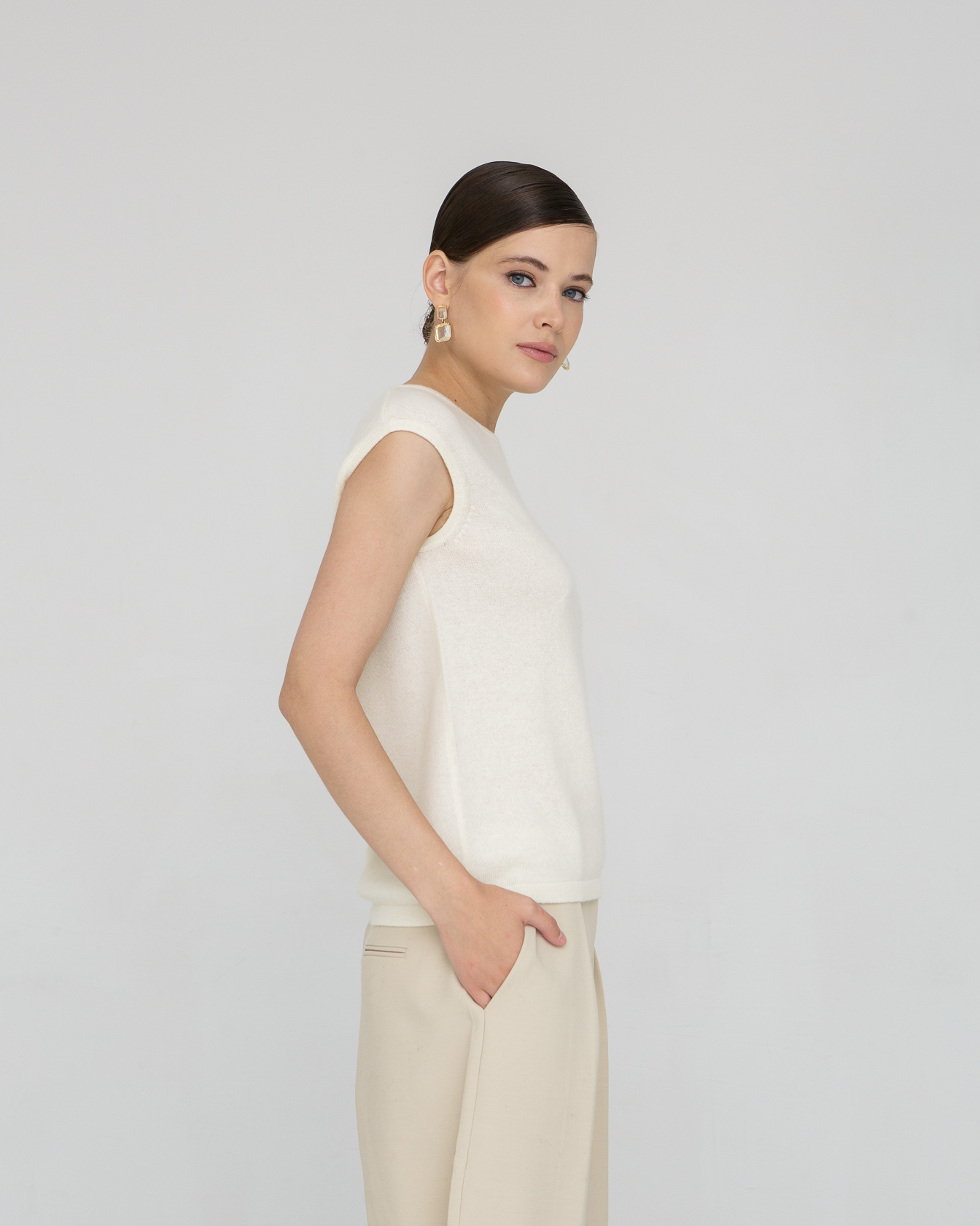 Безрукавный крой с круглым вырезом делает джемпер идеальным для layering-стиля. Сливочный оттенок — нейтральная база, которая гармонично дополняет любые цветовые решения. Прямой силуэт подходит разным типам фигуры.