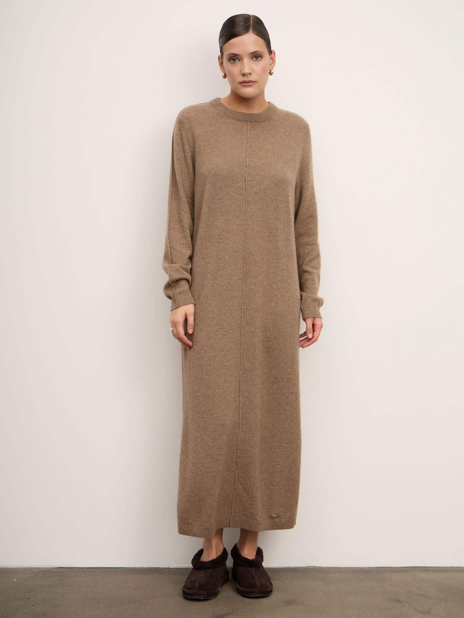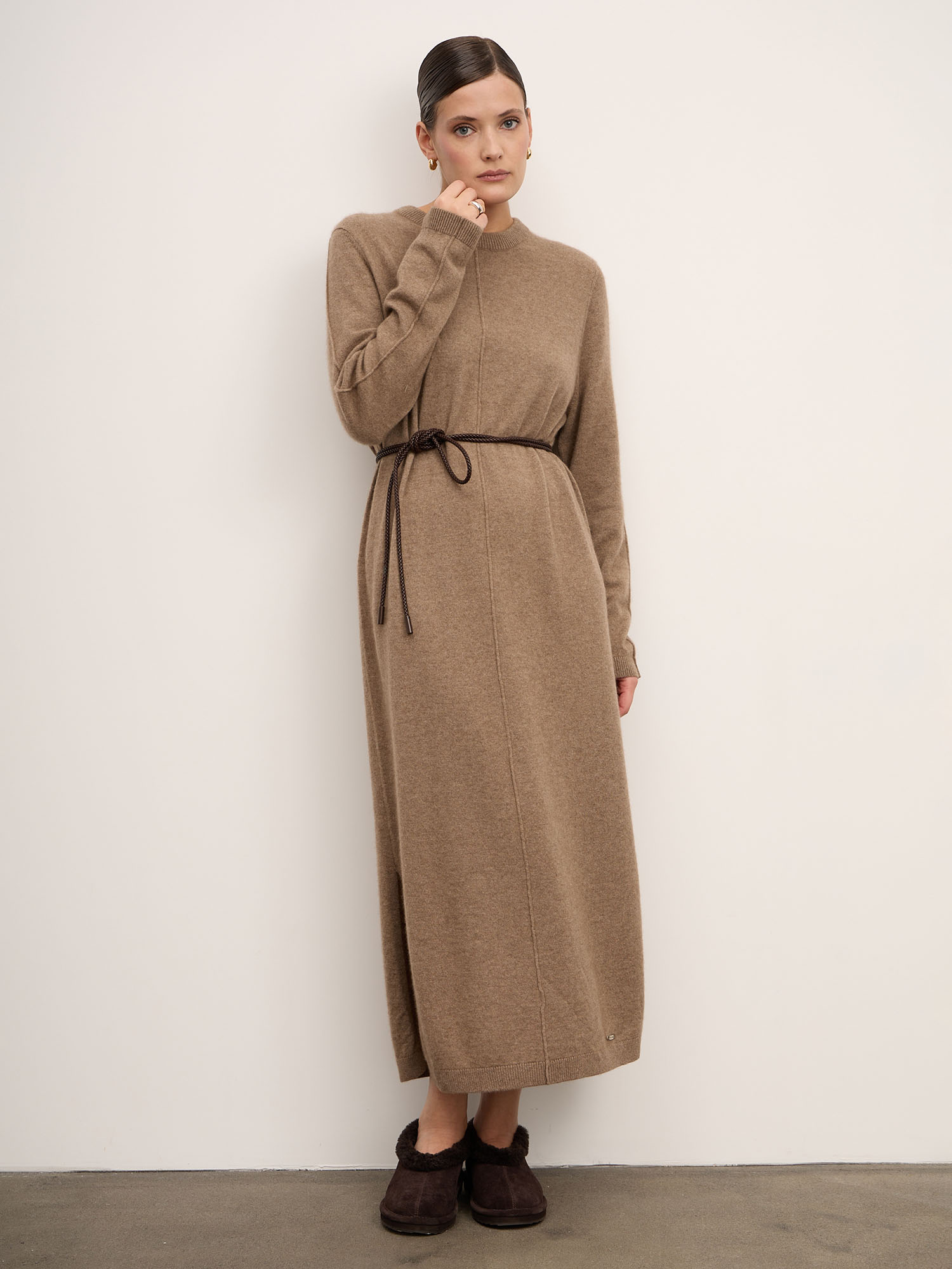 Платье выполнено в лаконичном прямом крое с длинными рукавами и округлым вырезом горловины. Эластичная вязка обеспечивает идеальную посадку и комфорт в движении. Натуральный оттенок капучино подчёркивает природную эстетику кашемира, делая образ мягким и женственным.
